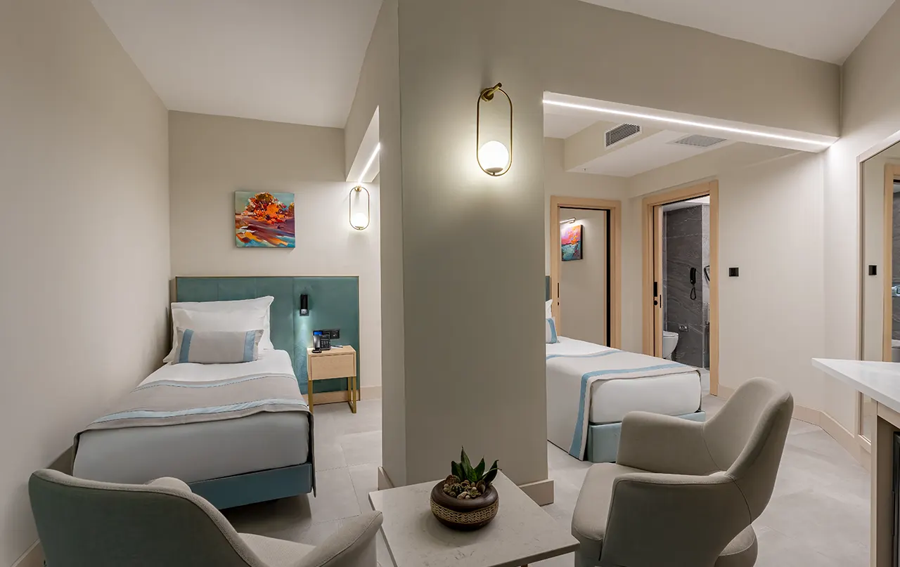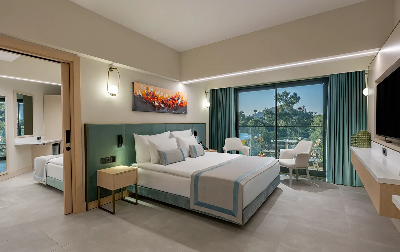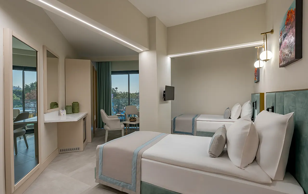 Located in the main building with garden and mountain views, the rooms include 1 double bed, 1 single bed and a sofa bed. They are designed to suit the needs of families with a capacity of 2 adults + 2 children or 3 adults + 1 child. Minimum capacity is 1 adult, maximum capacity is 2+1 or 3 people. They offer comfort and aesthetics together for family holidays.