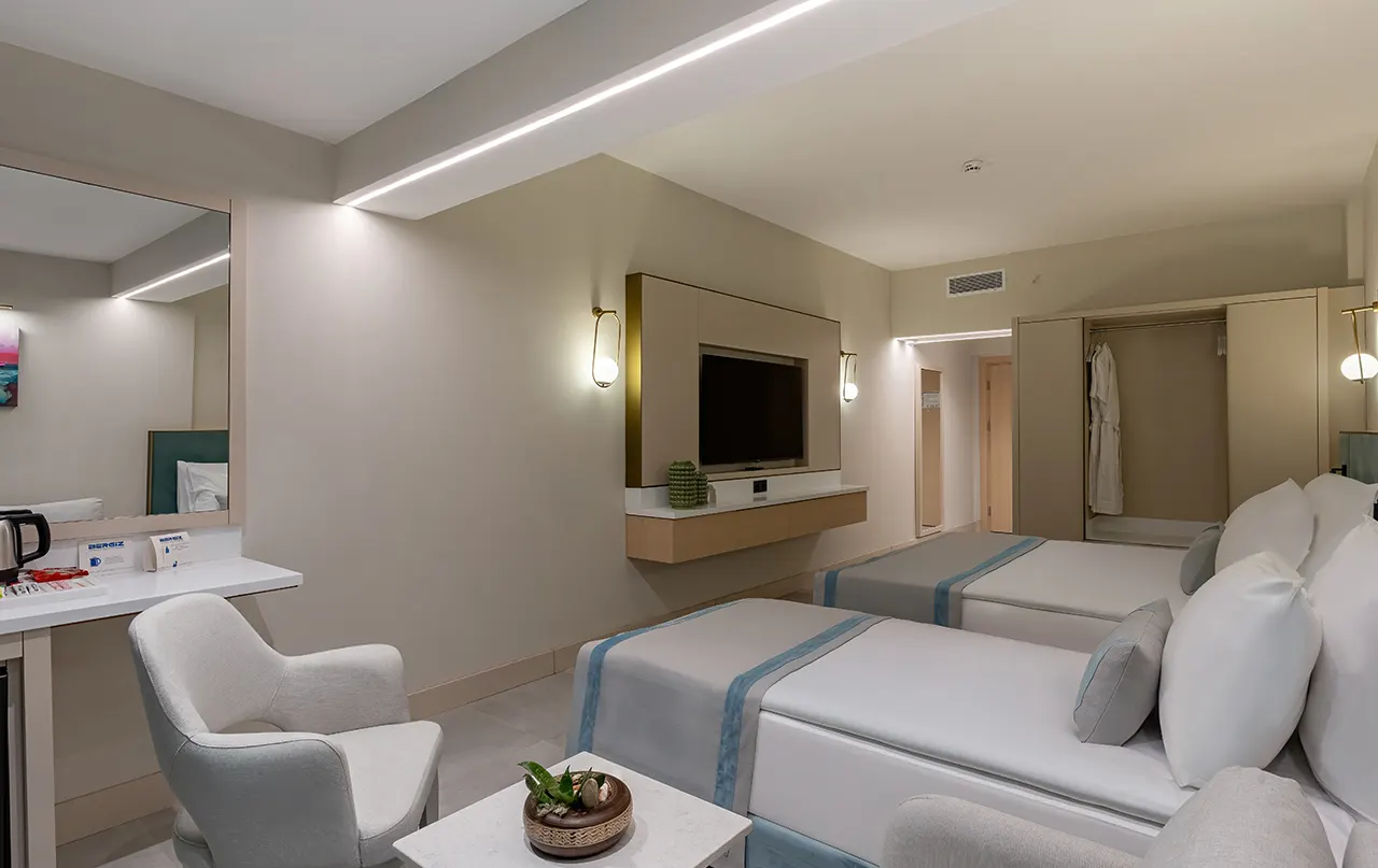 This 38 m² room has 1 double bed, 1 single bed and a sofa bed. The rooms offer a peaceful atmosphere with garden and mountain views, providing an ideal environment for a comfortable holiday. Located in the main building, this room is designed to suit the needs of families with a capacity of 2 adults + 2 children or 3 adults + 1 child.
